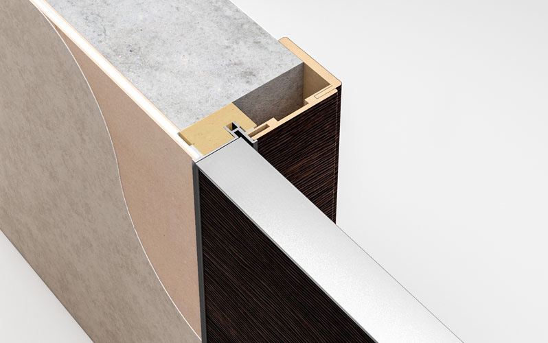 - дверное полотно с каркасом из натурального древесного бруса, покрытое грунтованным немецким мдф, обрамленное по периметру алюминиевой кромкой